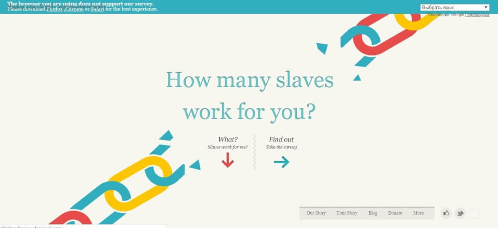 Slavery Footprint is an interactive website that is displayed in a creative storytelling structure. It informs users of their consumption habits that are connected with modern slavery. The website is very illustrative and has a wide range of interactive features. This sense of anticipation and fun interactivity entertains the user and prompts them to read more.